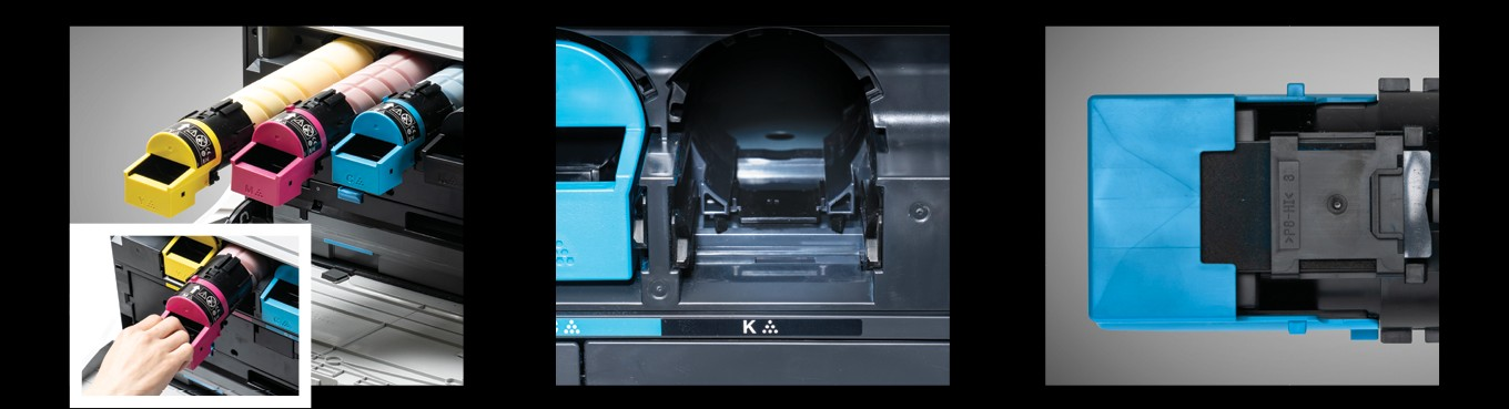 D470 시리즈의 토너는 컬러 그립 커버로 쉽게 색상을 구별을 할 수 있어서 손쉽게 장착 할 수 있으며 이전 모델 처럼 토너를 좌우로 비틀지 않고, 한번에 밀어 넣을 수 있어 토너 비산을 최소화 하였습니다.