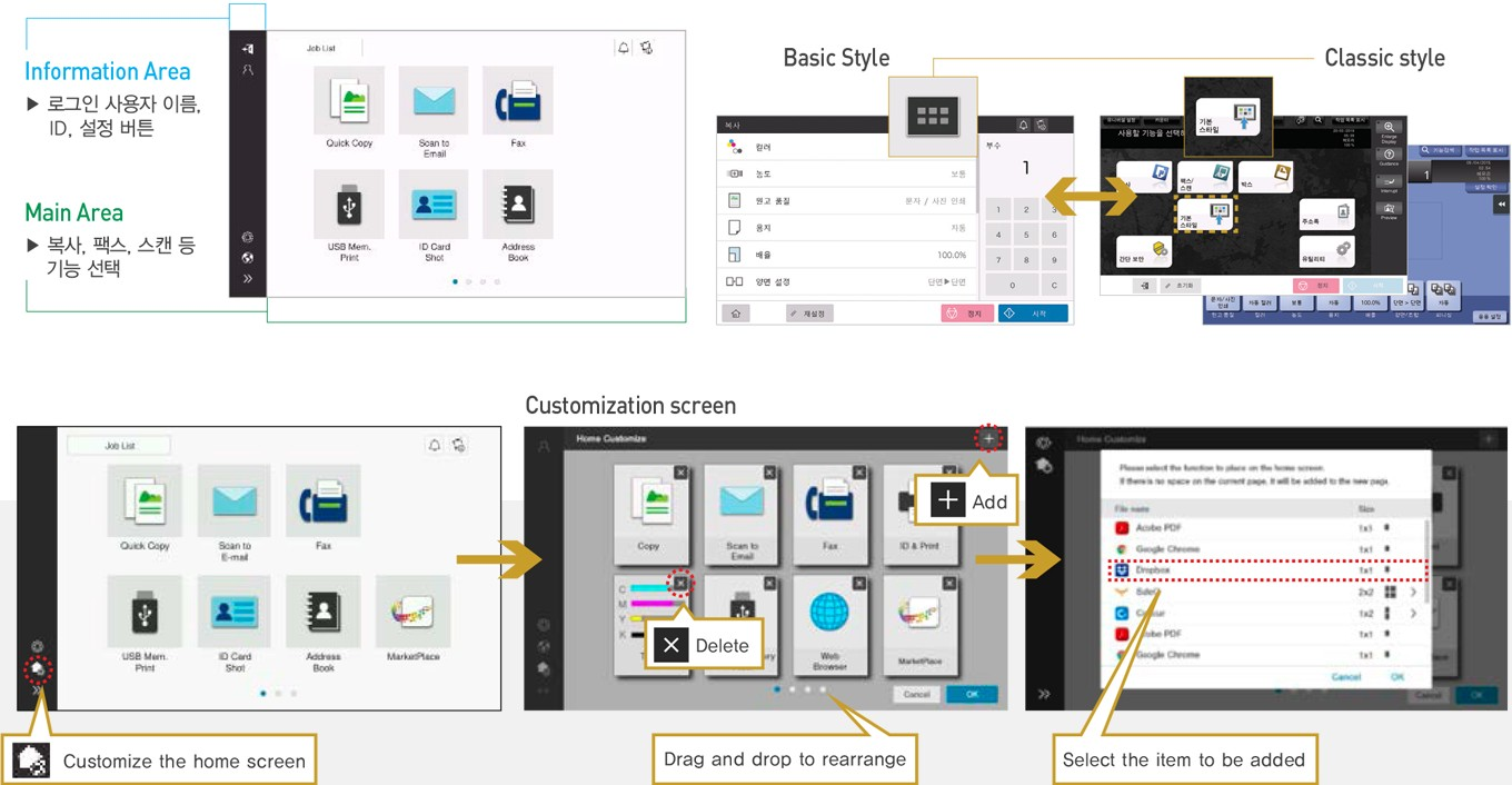 심플한 디자인의 새로운 GUI (Graphical User Interface)를 탑재하여 웹 브라우저를 기반으로 설계된 액정화면은 스마트폰이나 테블릿과 같은 조작성을 사용자에게 제공합니다. 사용 빈도가 높은 기능을 중심으로 화면 전환 및 원하는 기능을 손쉽게 디자인 할 수 있습니다.